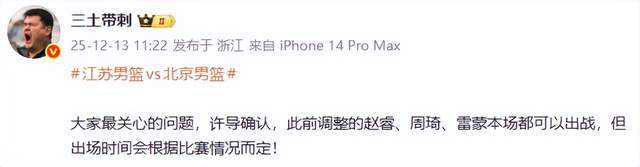 北京时间12月13日消息,2025-26赛季CBA常规赛全面开打,北京首钢男篮迎来首秀,客场挑战江苏男篮。此前因伤缺席了中国男篮比赛的赵睿,终于等来了好消息,根据媒体人三土带刺老师的报道,确定了,赵睿紧急复出!许利民迎来重大利好,3大强人联手,力拼开门红。