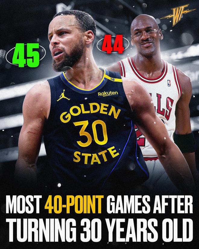 第二项:本场是库里30岁后第45次单场轰下40+得分,正式超越乔丹升至NBA历史第一。